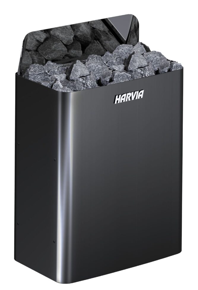 The Wall Black Steel boasts a clean, streamlined design. The heater fits into compact spaces and is suitable for all kinds of saunas, contributing to a stylish look. The model E sauna heater is controlled by a separate control unit.